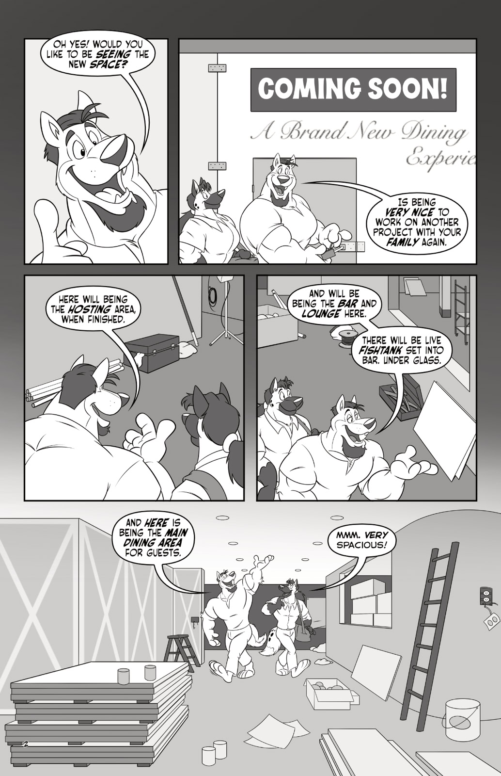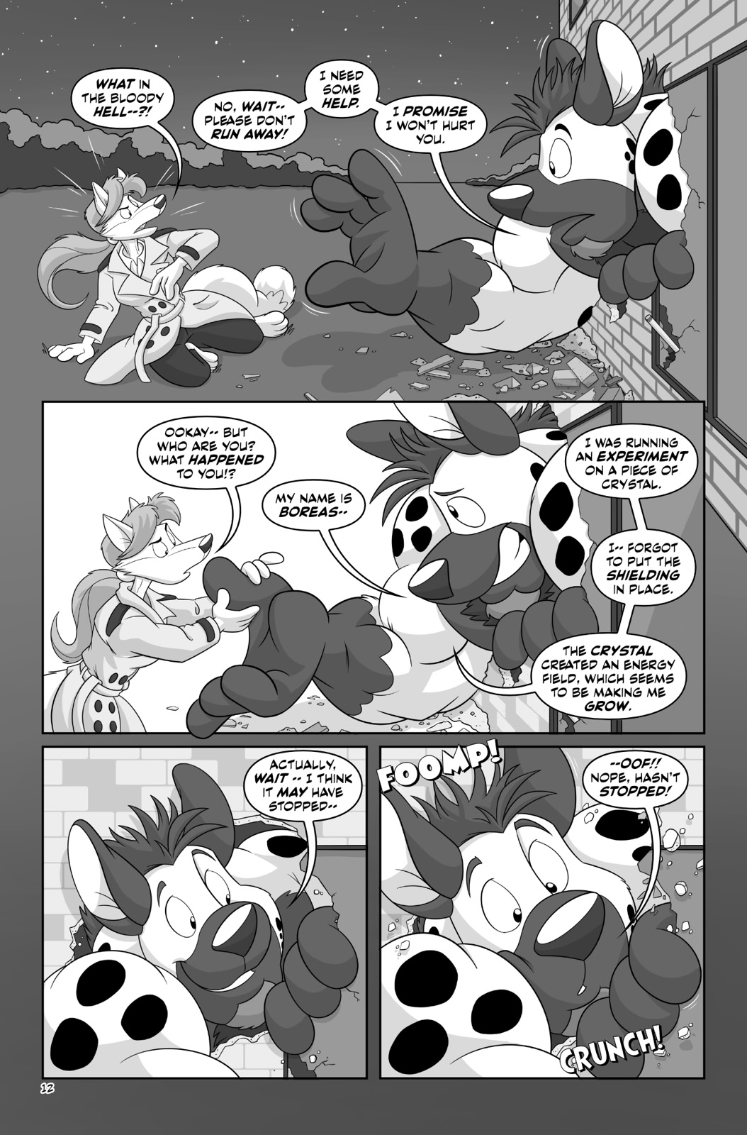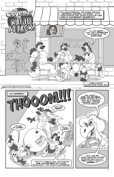 Each story is different. In Kaiju Attack!, a mad scientist releases disgruntled giant monsters on the city, and Zephyrus and Austeria have to use their growth powers to try to take them on. Small Business Growth! involves Zephyrus meeting up with his long-time friend Branko Stroganov at a restaurant location he’s working on; their amorous rendezvous ends with some minor property destruction when Zephyrus’ growth device accidentally triggers. How I Met Your Coyena Father! flashes back to reveal how Boreas and Aura first met when an experiment on a crystal with strange properties goes off the rails. And Reefer Bigness! shows Eurus meeting up with his old high school friend Benny Cheetah to share some weed that proves to have expansive properties.