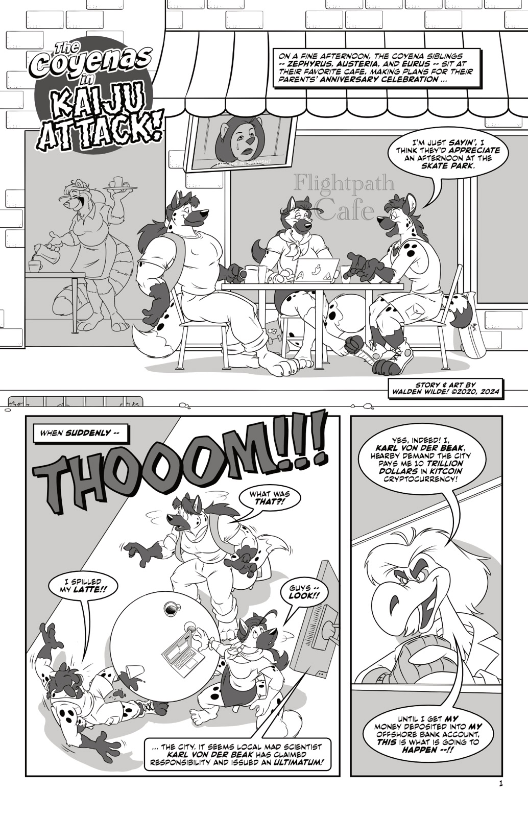 Coyena Comics are a series of short stories involving Walden’s family of coyenas: coyote-hyena hybrids loving in a world where both science and magic are abundant and allow for various size-changing shenanigans. Among the principle players: